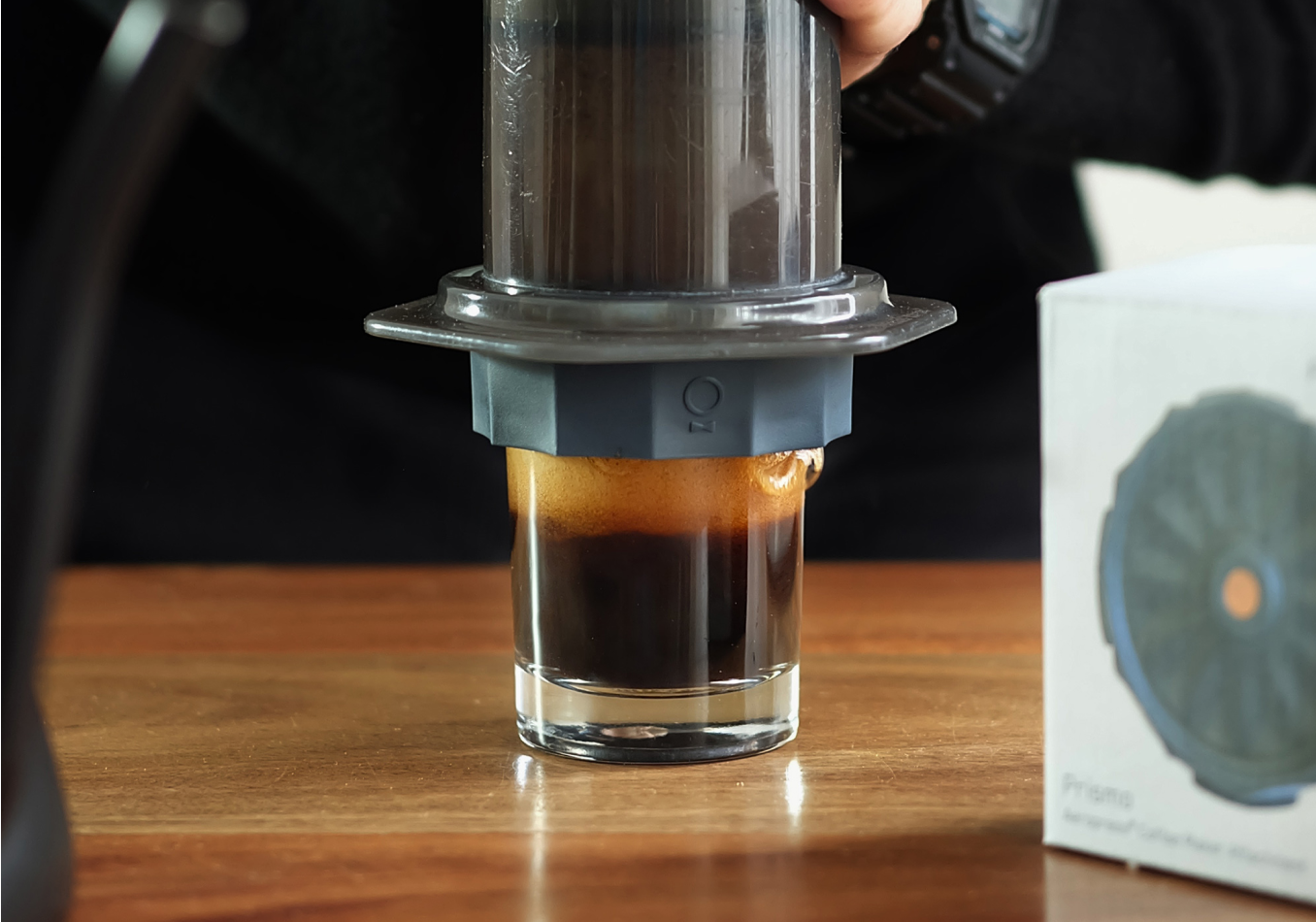 You can make espresso-style coffee with AeroPress® by using less water to coffee in your ratio, and perhaps grind a little finer. However, espresso machines push water through coffee grounds at extremely high pressures, which is the biggest driver in creating that thick, rich, creamy espresso texture. Using Prismo will also help you get closer to that fluffy, thick espresso texture by sealing the chamber of the AeroPress® and creating more pressure inside of it.