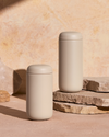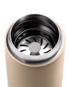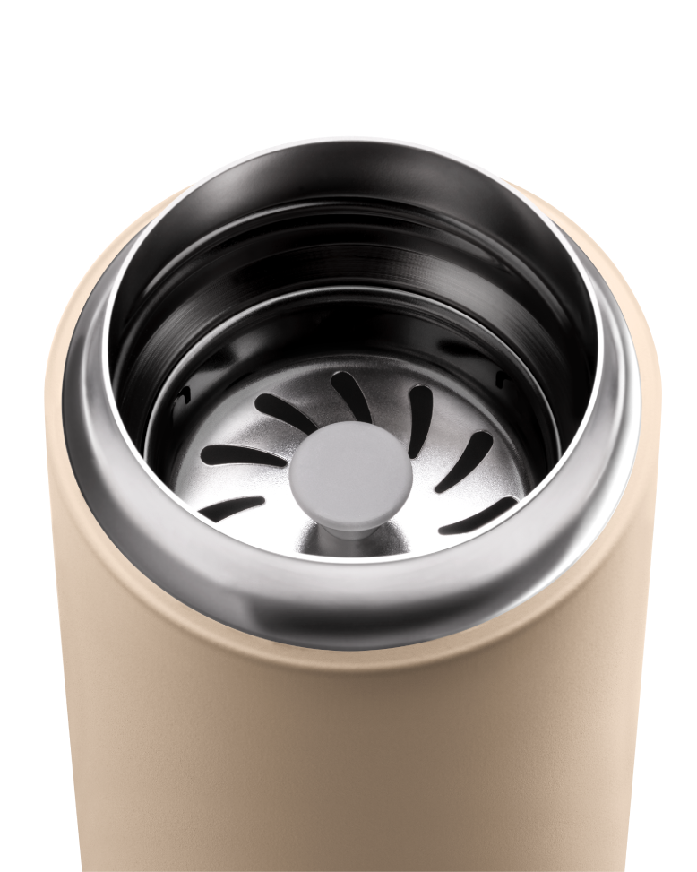Beige Fellow Carter Move Mug with removable metal strainer on a white background.